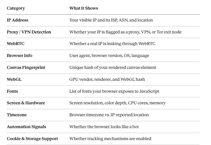 • Canvas / WebGL — For anti-detect browser setups, verify these are producing consistent (but not identical) hashes.